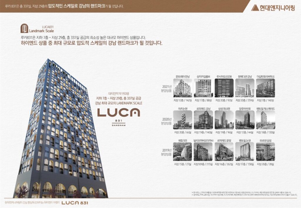 하이엔드 오피스텔은 희소하지만, 대단지는 극히 드뭅니다. 루카831은 지하 7층부터 지상 29층에 이르는 337실 규모로, 강남 하이엔드 오피스텔 중 단일 동으로는 최대 규모를 자랑합니다. 현대엔지니어링의 완벽한 시공 능력이 더해져, 단순한 건물을 넘어 강남의 스카이라인을 새롭게 정의하는 랜드마크가 될 것입니다.