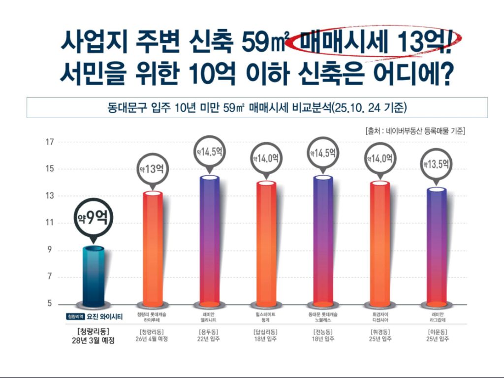 현재 동대문구 신축 전용 59㎡ 시세는 15억 원을 상회합니다. 하지만 청량리역 요진 와이시티는 9억 원대라는 파격적인 분양가를 제시합니다.